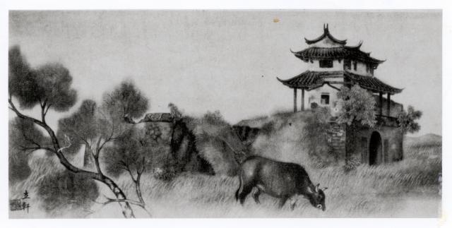 林玉山入選首回臺展的兩幅畫作,《大南門》【圖1】與《水牛》【圖2】都是忠實於寫生的作品,這樣忠於客觀寫生,順境而生,也符合他溫和謹慎的生活態度。《大南門》原作已不存,速寫稿卻保留下來,兩者非常相近,尤其城牆外樹叢的光影變化表現的一致性,令人吃驚。事實上,大約在同一年,林玉山還有一件作品,也是用水墨來表現樹葉的量感與光線變化。畫中的房子與臺灣的不同,推測應該是在東京創作的。
