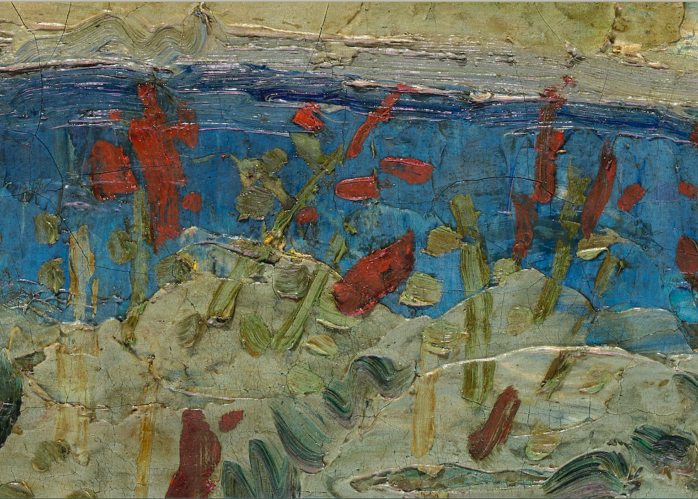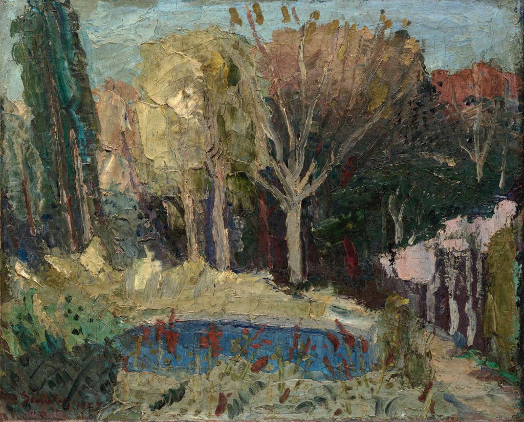 作品的日文原題「芽ぐむ」和畫家的名字以紅字書寫在作品背後的畫框上。畫中圍繞水池的常綠植物綠意盎然,不過構圖聚焦於中心部枝幹裸露的落葉木,烘托出早春萌芽,新芽若隱若現,生機萌動的氣息。設色濃厚豐郁而明亮,豪邁的色塊和刮痕給作品帶來無窮的韻味。【圖3】