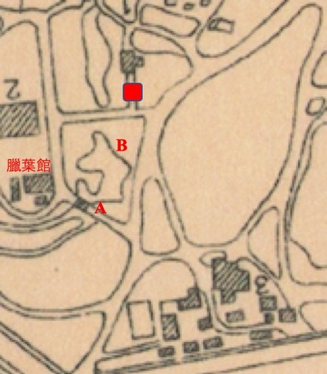 判斷的根據除了水池和土堤的方向以外,畫面右上角背景的赭紅色部分也提供了重要線索。倖存的戰前植物園指南中有各個園區的植物、建築物等的說明。[5]依據該資料,水池北邊,隔著小路微偏東邊的地點處,有一棟時髦的建築,在當時作為會議室使用。據元老所言,這個建築有赭紅色傾斜的屋頂,戰後還存在一段時間。鹽月作品右上角的赭紅色部份就是描繪這棟建築。