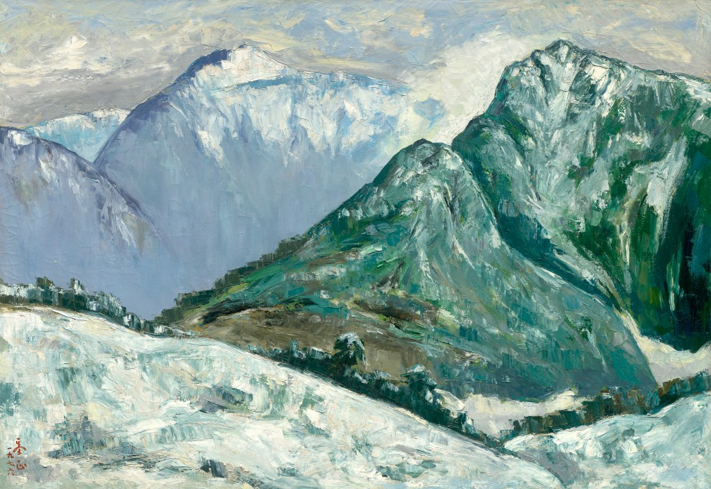 1976年呂基正在明星咖啡廳舉辦個展,他表示在這裏辦展,就好像在自己畫室般的親切。[4] 展品中有件描繪高山雪景的畫作—《冰天雪地》(1974年,圖2)。個展結束後,呂基正率領青雲畫會的會員前往東京,參加亞細亞現代美術展,展出另一件同名畫作(1976年,圖3)。[5] 這兩件作品雖然都是描繪大雪過後一片冰天雪地的景色,然而表現出來的意境卻有所不同。在1974年的作品中,厚厚的白雪覆蓋了層層疊疊的山脊,瞭望群峰,彷彿令人感到切膚寒意。然而,在1976年的作品中,描繪的是大雪過後,雪霽天晴的情景。
