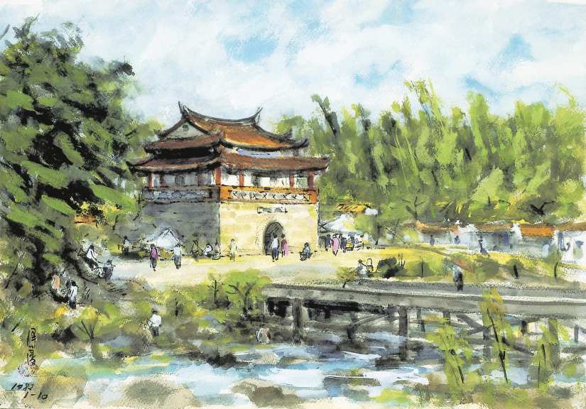 位於潛園附近的孔廟、東門城,與另一座名園「北郭園」同樣是承載著畫家回憶的場域。其中,東門城是仍在原址且保存狀況最為完好的古蹟,它坐落在新竹市區最為繁忙的圓環中央,靜靜照看著一座城市的成長。