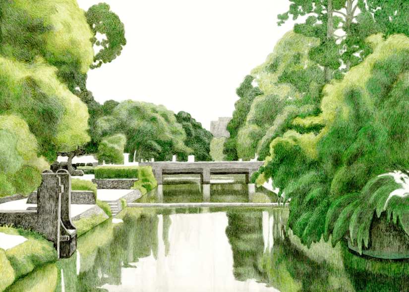 護城河公園也是李澤藩畫作裡的常客,是東門城相關主題裡的必備元素。從李澤藩的水彩寫生,到我的高中記憶,再到現在的風景,公園周遭景觀隨著城市的新陳代謝變動著。有些李澤藩記憶中的風景早已不復存在,也有些我以前常常閒逛的地方消失了。不過這裡依舊是每次我回到新竹會想去看看的地方,從前的回憶仍會在不知不覺的敲擊著我的心頭。 離開新竹多年,從起初每個月回來一次,再到後來兩、三個月一次,時間拉長,熟悉的家鄉漸漸成了有距離感的地方。也許正因如此,我才會迫切的想把這座公園給畫下來吧!