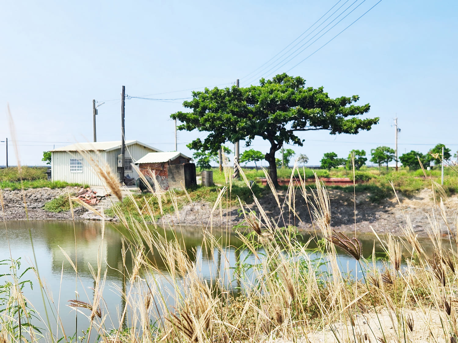 過了曾文溪後,我開上濱海公路,這條高架道路橫臥在鹽分地帶的土地上,左邊是大海,右邊是魚塭,兩側都是滿滿的藍色,帶給我一種行駛在水上的錯覺。明媚的陽光照得水面波光粼粼,點綴著低矮的樹叢,以及幾間陳舊的農舍,風景非常漂亮。沒多久,我來到了一個被魚塭包圍起來的小社區,將車停在附近一處開闊的石礫場上。這個小社區便是洪通故居的所在地。