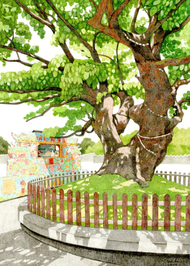 他是在廟前的大樹下展示作品時被記者發掘的,隨後在美術界引起旋風般的熱潮。今日的廟前有兩棵老樹分列左右,我猜想,或許這兩棵老樹就是當年洪通展示畫作的地方。